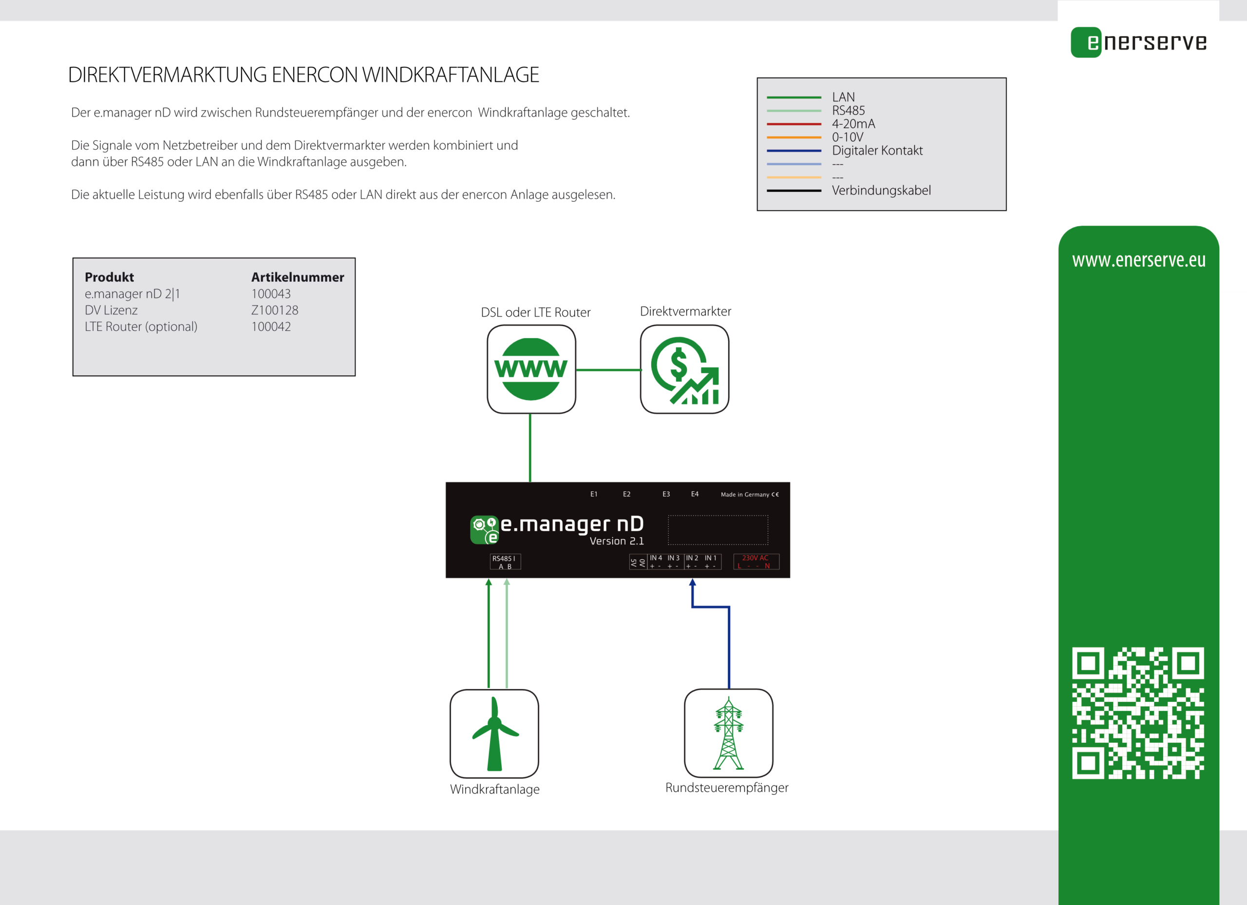 Für die Steuerung der Windkraftanlage werden die bereits vorhandenen Signale vom Rundsteuerempfänger aufgenommen und mit der Vorgabe des Direktvermarkters kombiniert und dann direkt an die enercon Windkraftanlage per Modbus TCP oder RTU gesendet.