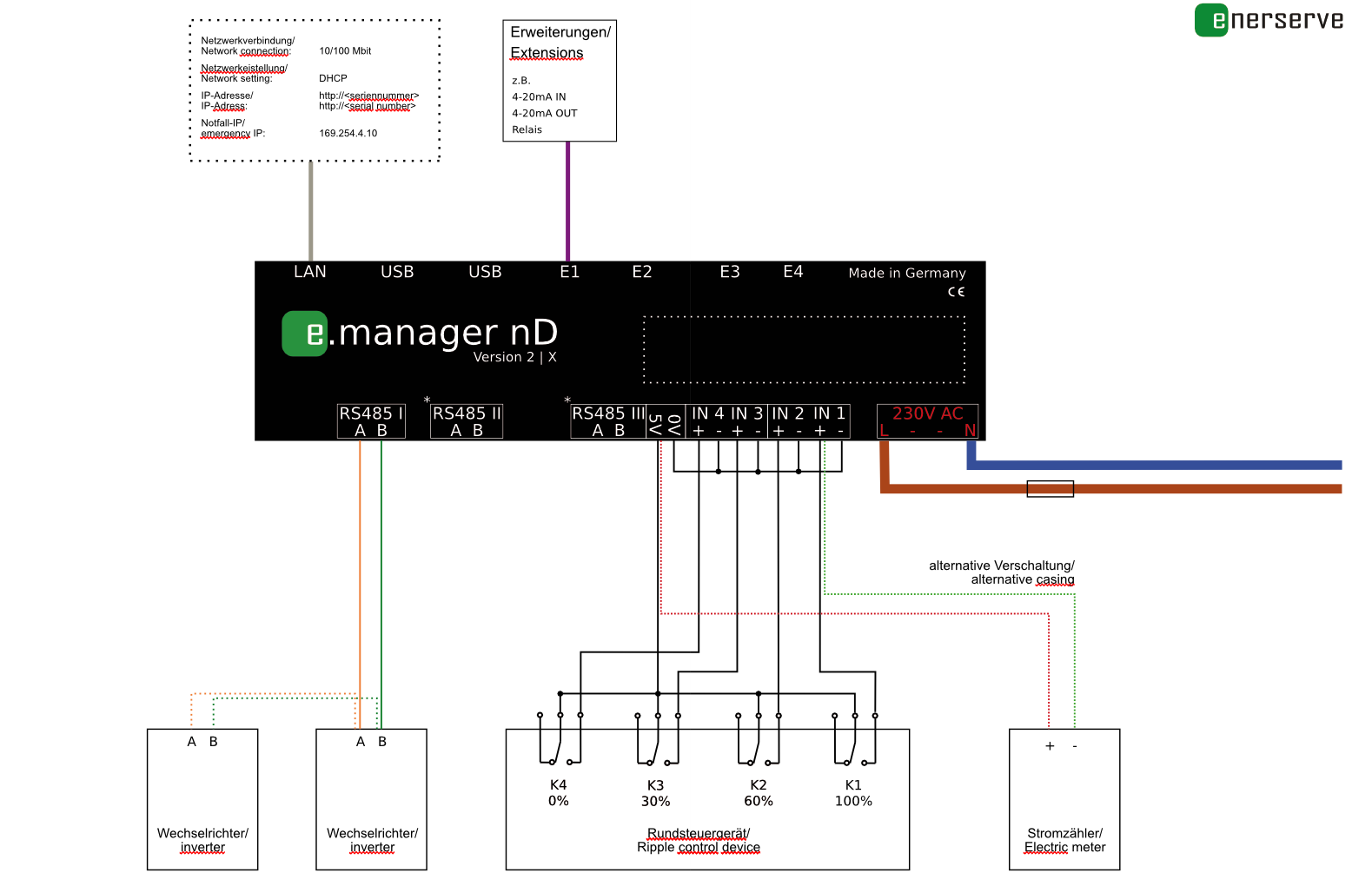 Schließen Sie den e.manager nd Version 2 oder den e.manager mc Version 2 an 230V AC an. Es wird empfohlen eine separate Leitungsschutzschalter zu verwenden.