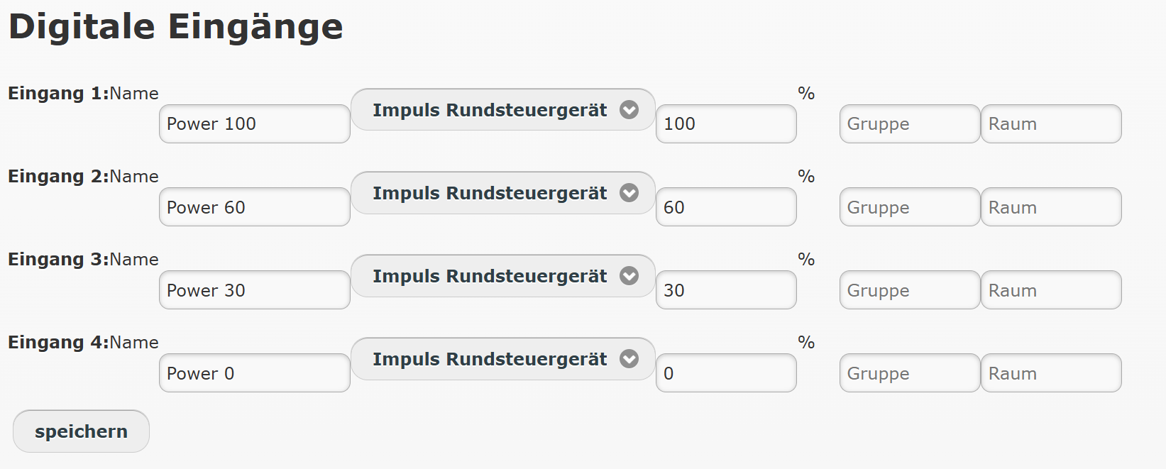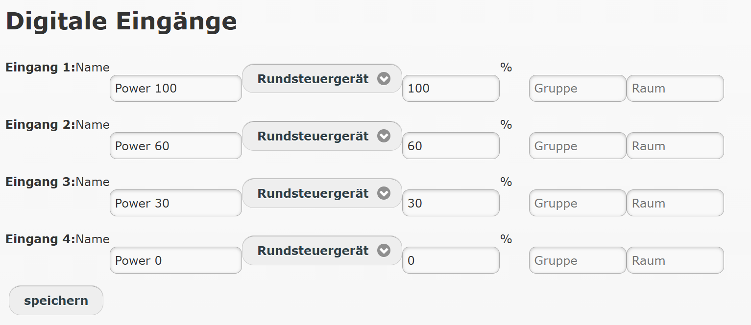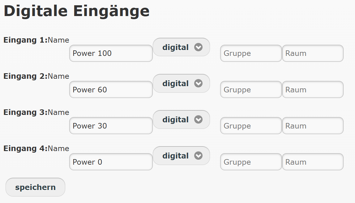 Setzen Sie unter Konfiguration => Geräte konfigurieren den gewünschten Eingang auf digital. Vergeben Sie einen eindeutigen Namen, wie z.B. K1, K2, …