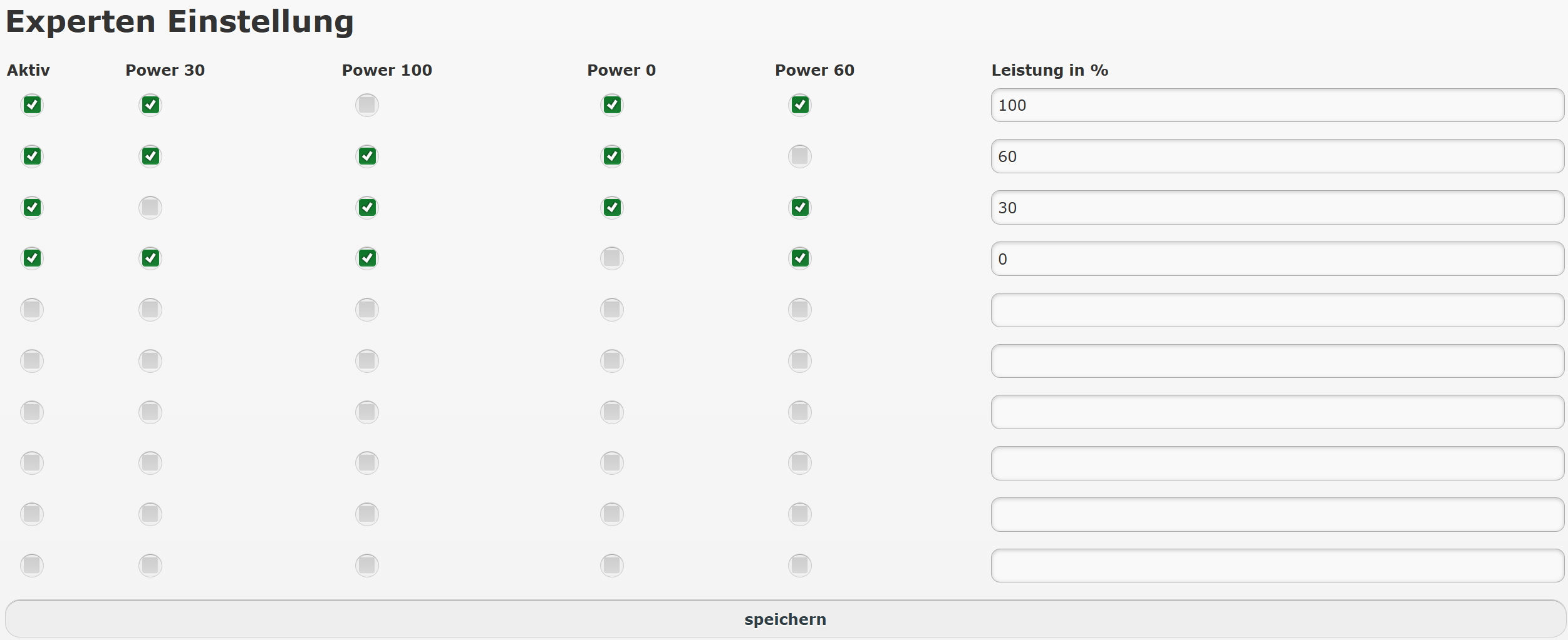 Unter Konfiguration => Leistungsreduzierung finden Sie nun die aktivierten Eingänge. Nun können Sie nach belieben bis zu 10 Varianten mit entsprechender Prozentangabe eintragen.