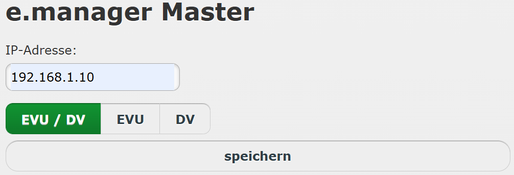 Wenn vor Ort 2 oder mehr e.manager installiert sind und ein e.manager als Master für die Leistungsregelung arbeitet, können Sie bei den anderen e.manager die IP Adresse vom Master Gerät eingeben.